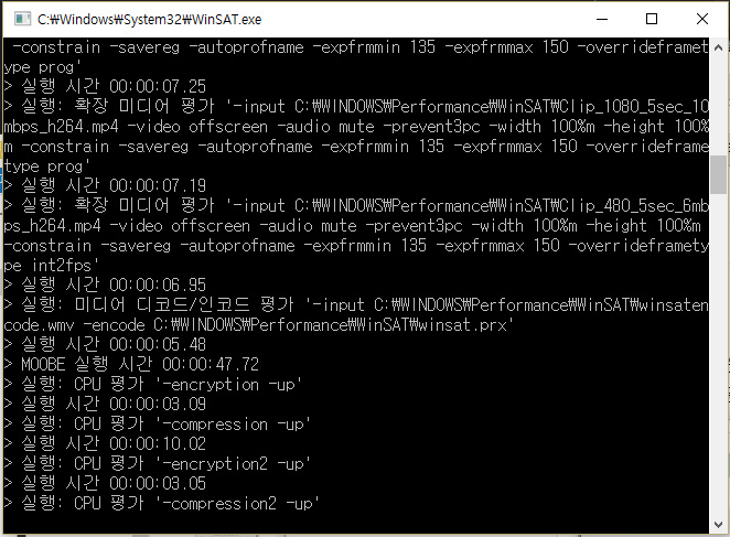 압축파일을 풀어 ExperienceIndexOK.exe 파일을 실행해 측정이 시작되면 다음과 같은 CMD 창이 뜨면서 수 초간 내 PC의 성능이 낱낱이 분석당한다.